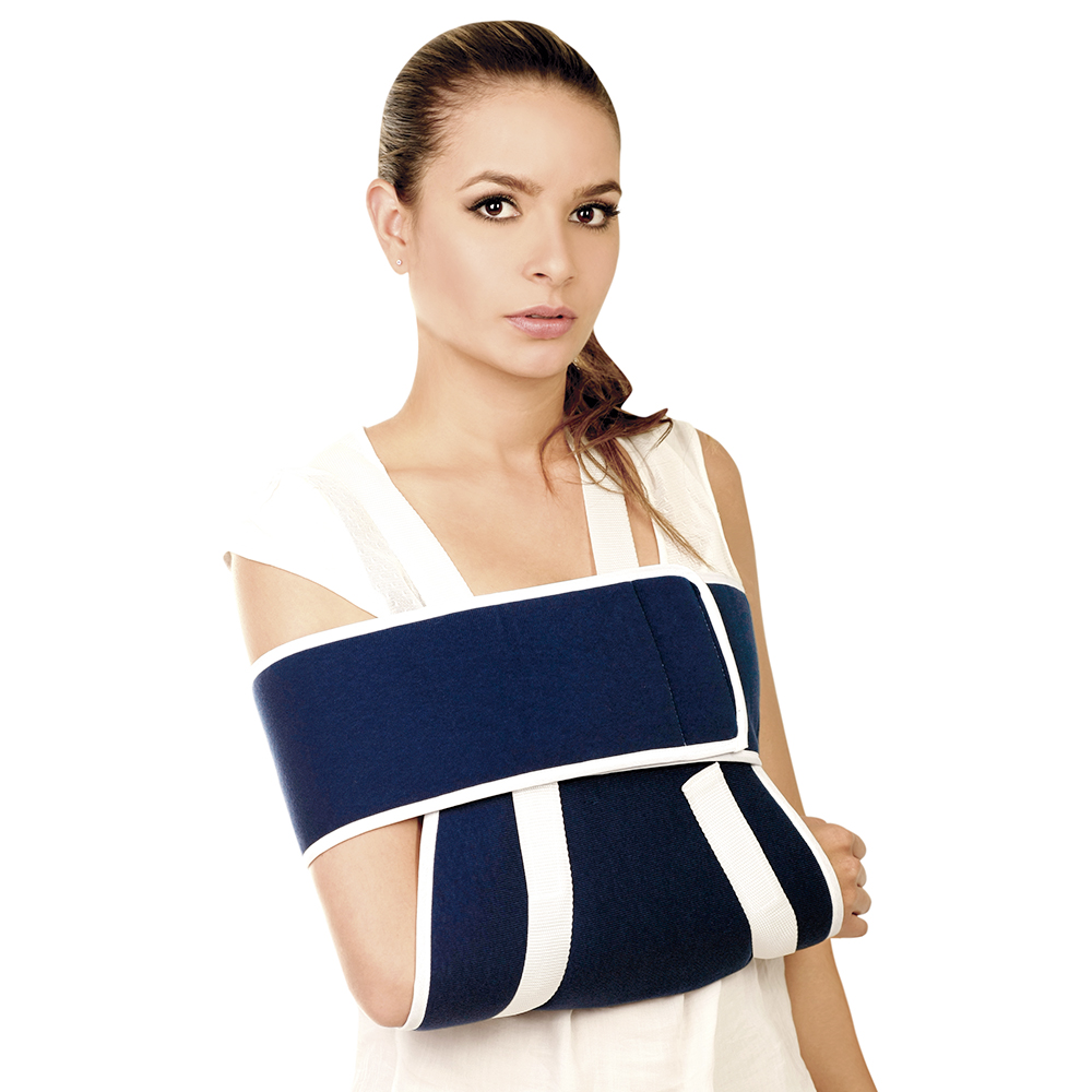Su diseño en forma de bolsa da soporte al antebrazo y la banda se coloca alrededor del tronco para garantizar la inmovilidad del hombro. Fabricado en tela acolchada para confort del paciente. El codo debe quedar 90̊ grados y alineado con la mano. Su posición a la altura del pecho.