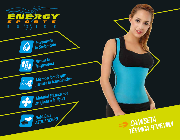 Camiseta femenina fabricada en neopreno micro perforado que permite la transpiración, doble faz, tiras anchas en hombros, espalda cubierta, senos libres. Diseño anatómico que se ajusta al cuerpo.