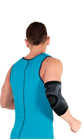 Soporte deportivo ambidiestro para codo que proporciona una mejor fijación sobre la piel y estabilidad en el movimiento.
