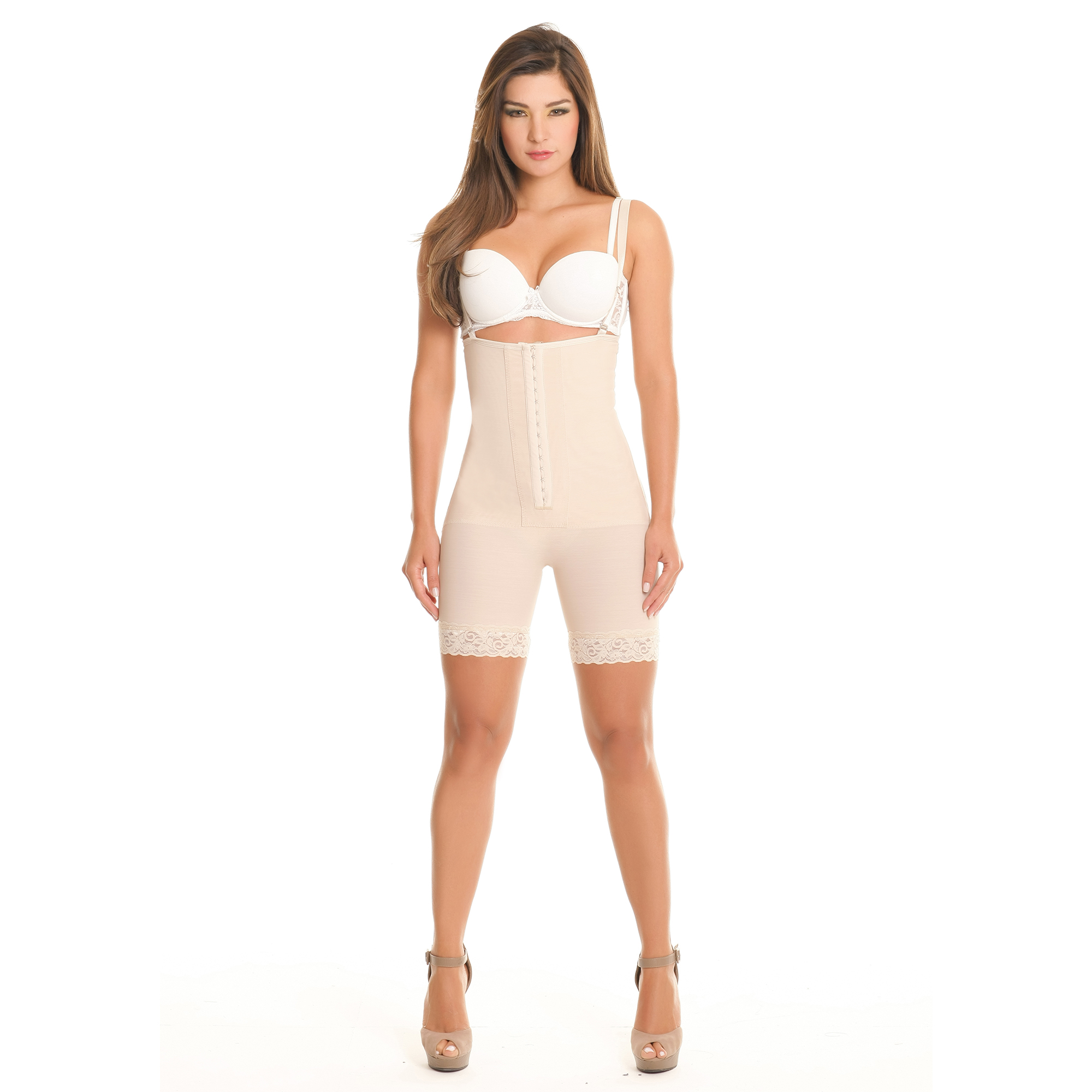Prenda en powernet de compresión media, forrada en lycra suave, tiras de tela graduables en el hombro según estatura y talle , abrochadura en gafete de 2 tiempos, sistema de senos libres , glúteos libres con lycra, esta faja tiene un largo a la mitad del muslo.