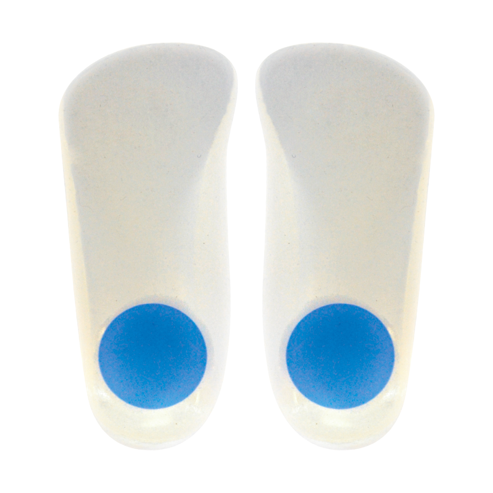 Plantillas fabricadas con silicona viscoelástica con apoyos metatarsal y calcáneo en diferente densidad y con puente. La puntera del pie queda libre. Diseño anatómico con elevación e inserciones de silicona que absorben el impacto en las zonas de mayor presión del pie.