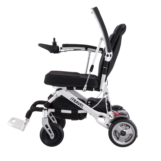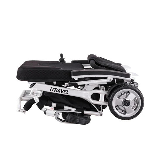 Silla motorizada electrónica de tracción posterior con estructura plegable para transporte facilitado.